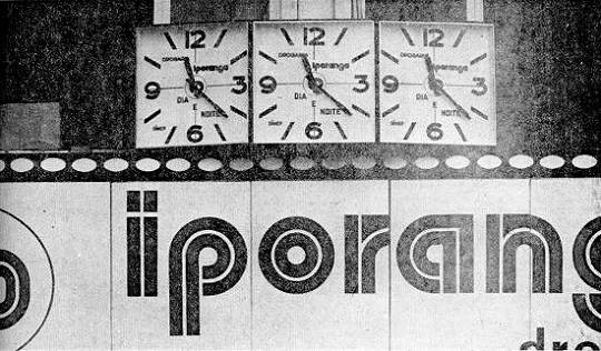 Os relógios públicos - Outra opção é a consulta aos relógios existentes nas estações ferroviárias, igrejas e algumas repartições, além de relógios promocionais. Acaba de ser inaugurado na Praça da Independência um relógio a quartzo, com três mostradores, na fachada da Drogaria Iporanga. Os proprietários do estabelecimento consideram o aparelho, marca Dimep, "o que há de mais moderno em relógio exposto na Cidade". É movido a eletricidade, mas possui uma bateria que lhe assegura o funcionamento ininterrupto por duzentas horas. Entre o custo do relógio e sua promoção, calcula-se um gasto de mais de Cr$ 50 mil. O relógio conta ainda com um relógio-comando interno, controlado pelo horário fornecido pela Agência Nacional, através da Hora do Brasil.