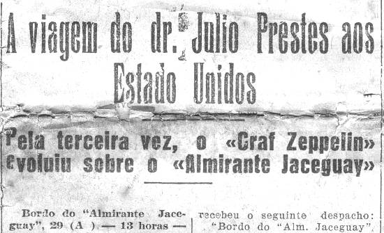 Trecho de notícia sobre a viagem de Júlio Prestes aos Estados Unidos, na página principal do Jornal Commercio de Santos, de 30 de maio de 1930