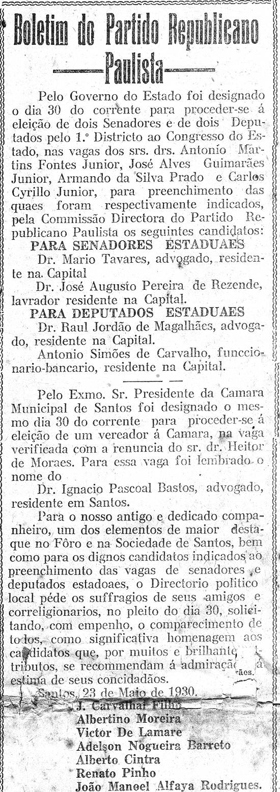Para o nosso antigo e dedicado companheiro, um dos elementos de maior destaque no Foro e na sociedade de Santos, bem como para os dignos candidatos indicados a preenchimento das vagas de senadores, deputados estaduais, o Diretório político local pede os sufrágios de seus amigos correligionários, no pleito do dia 30, solicitando, com empenho, o comparecimento de todos, como significativa homenagem aos candidatos que, por muitos e brilhantes atributos, se recomendam à admiração e estima de seus concidadãos.