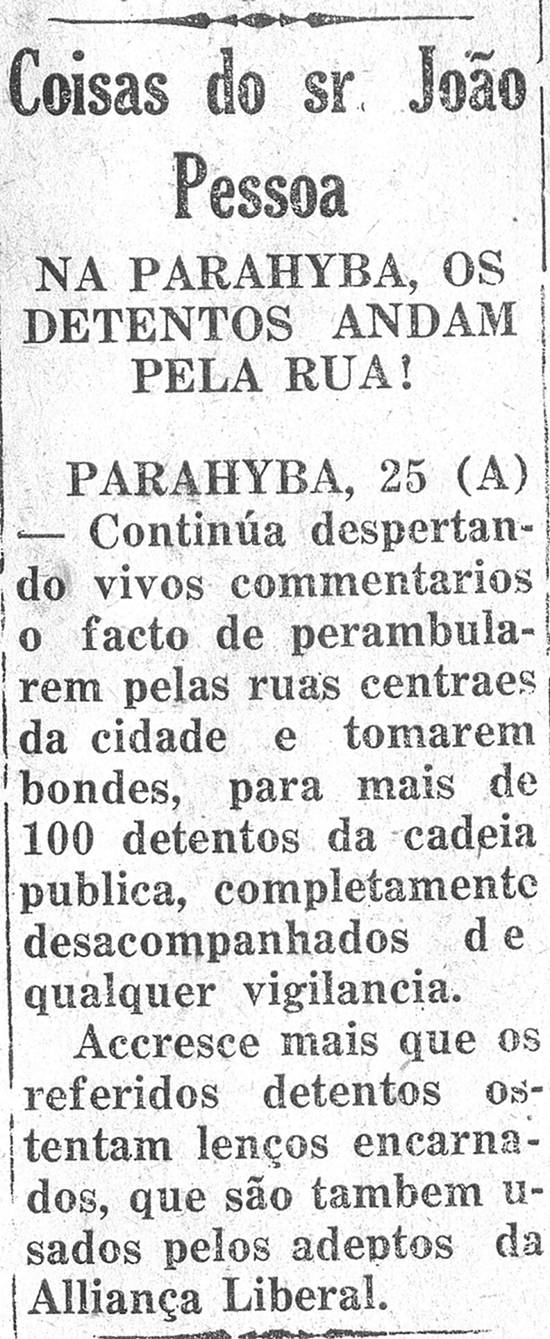 PARAÍBA, 25 (A) - Continua despertando vivos comentários o fato de perambularem pelas ruas centrais da cidade e tomarem bondes, para mais de 100 detentos da cadeia pública, completamente desacompanhados de qualquer vigilância.