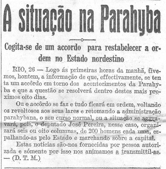 Ou o acordo se faz e tudo ficará em ordem, voltando os revoltosos aos seus lares e retomando a administração paraibana o seu curso normal, ou a situação se agravará, pois o deputado José Pereira, nesse caso, organizará seis ou oito colunas, de 200 homens cada uma, espalhando-as pelo estado e marchando sobre a capital.