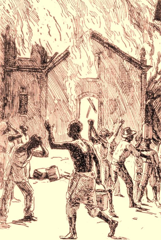 perversidade, ateara fogo àquela casa de Deus. De nada valeram os esforços dos negros escravos, que, com água e areia, tentaram dominar o fogo. O
