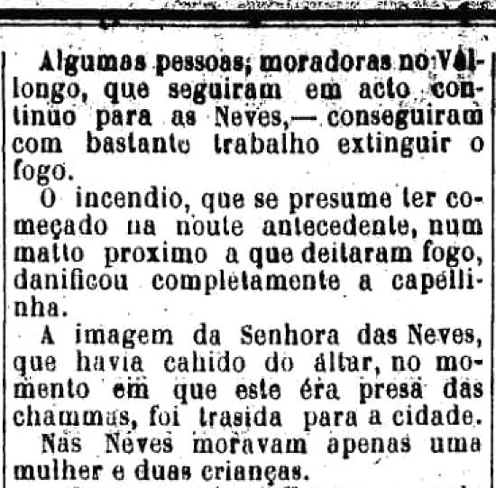Capela de Nossa Senhora das Neves estava presa das chamas. O fogo foi extinto por pessoas do Valongo, que, de imediato, seguiram para o lugarejo, de