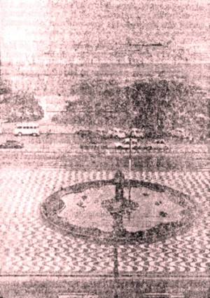 imponente, um monumento representando a figura de um santo, jardim, muitas árvores. Em meio a tudo isso, figuras rotas, esfarrapadas. Dez, 20 ou
