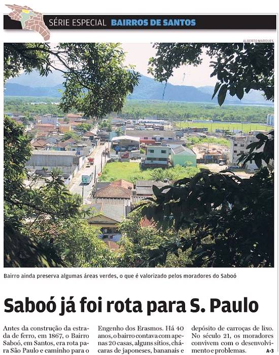 SABOÓ JÁ FOI ROTA PARA S. PAULO - Antes da construção da estrada de ferro, em 1867, o Bairro Saboó, em Santos, era rota para São Paulo e caminho para o Engenho dos Erasmos. Há 40 anos, o bairro contava com apenas 20 casas, alguns sítios, chácaras de japoneses, bananais e depósito de carroças de lixo. No século 21, os moradores convivem com o desenvolvimento e problemas