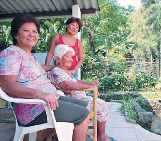 A imigrante japonesa e as filhas no jardim da casa, no Saboó
