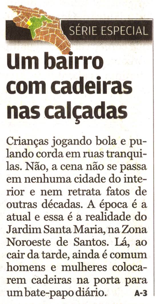e essa é a realidade do Jardim Santa Maria, na Zona Noroeste de Santos. Lá, ao cair da tarde, ainda é comum homens e mulheres colocarem cadeiras