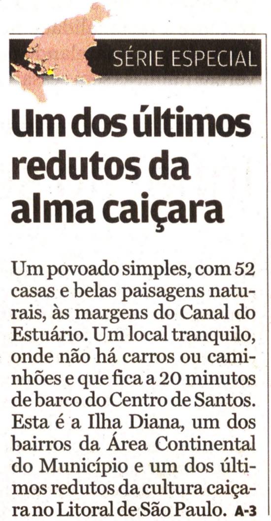 Santos. Esta é a Ilha Diana, um dos bairros da Área Continental do Município e um dos últimos redutos da cultura caiçara no Litoral de São Paulo.