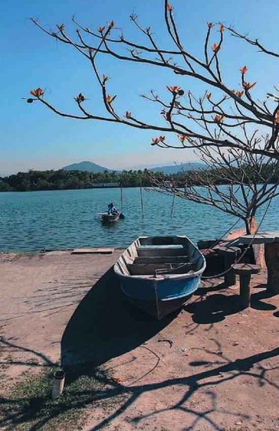 quadrados, avistamos um povoado simples, com casas rústicas, pequenos barcos de pesca amarrados no píer, pescadores preparando suas redes,