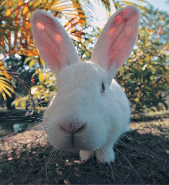 Há cerca de cinco meses, o simpático e pacífico coelho branco chegou à Fazenda Cabuçu. Ele