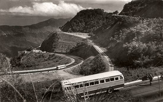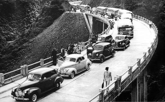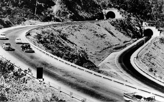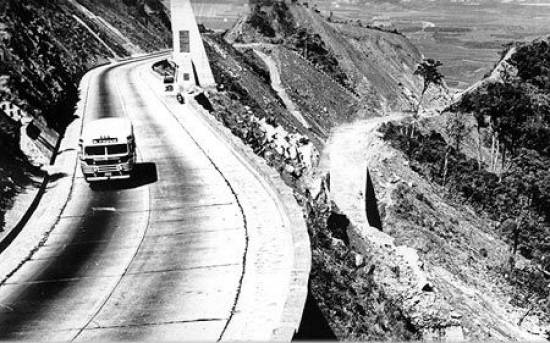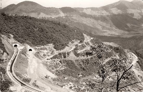 Trecho da Serra, na Via Anchieta, na década de 1940, antes de terminada a pista no nível inferior