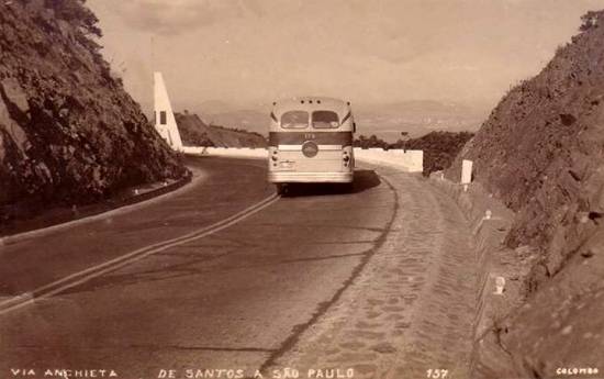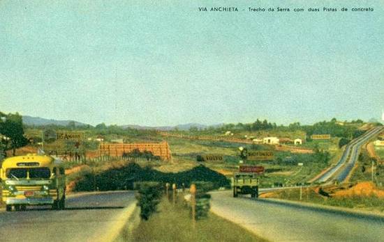 Trecho de planalto da Via Anchieta, em São Bernardo do Campo, já com as duas pistas, por volta de 1950, em cartão postal que mostra, à esquerda, um ônibus verde-amarelo do Expresso Brasileiro Viação Ltda., procedente de Santos, e à direita um caminhão descendo para o litoral