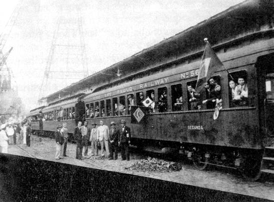 Em 1935, trem no porto santista se prepara para levar imigrantes japoneses