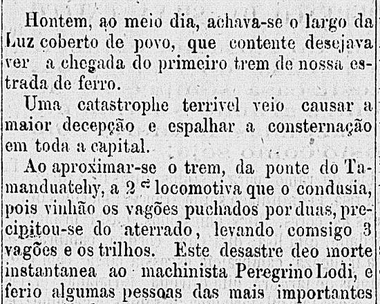 Ao aproximar-se o trem da ponte do Tamanduateí, a 2ª locomotiva que o conduzia, pois vinham os vagões puxados por duas, precipitou-se do aterrado, levando consigo 3 vagões e os trilhos.