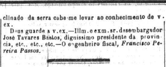 Deus guarde a v. excia. - Ilmo e exmo. sr. desembargador José Tavares Bastos, digníssimo presidente da província etc. etc. etc. - O engenheiro fiscal, Francisco Pereira Passos.