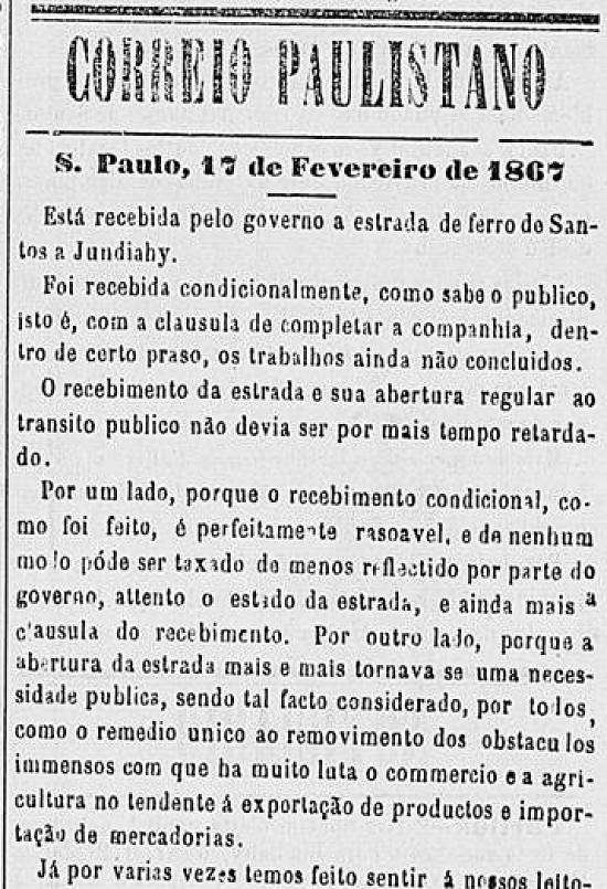 S. Paulo, 17 de fevereiro de 1867 - Está recebida pelo governo a estrada de ferro de Santos a Jundiaí.