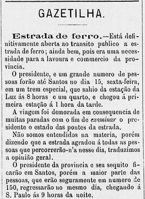 A estrada de ferro aberta ao trânsito é um novo problema a ser estudado não só pelos habitantes de Santos, S. Paulo e Jundiaí, mas pelos de outras localidades do interior da província,