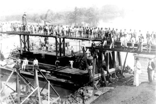 Imigrantes italianos construindo uma ponte ferroviária na linha Mayrink-Santos: