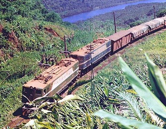 ferrovia Mayrink-Santos: mostra um trem de carga tracionado por duas locomotivas elétricas Lobas de 2000 HP fabricadas pela General Electric e