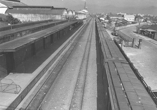 Já a foto a seguir, também na estação ferroviária vicentina e feita em 1977 por um fotógrafo do Cidade de Santos,