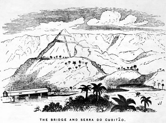 PONTE E SERRA DO CUBATÃO - Gravura feita a partir de um daguerreótipo mostrando a Estrada da Maioridade do livro de Kidder e Fletcher Brazil and Brazilians.