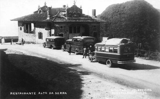 Ônibus da linha entre Santos e São Paulo parados no restaurante então existente no Rancho de Paranapiacaba, cerca de 1940, em cartão postal Preising nº 436
