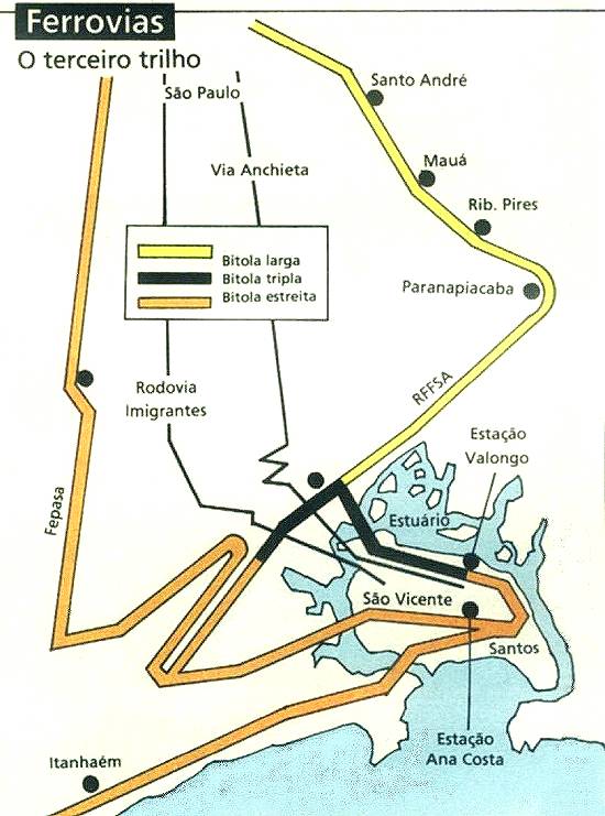 de bitola larga da RFFSA, na confluência do sistema ferroviário próximo à região continental de São Vicente, seguindo até a