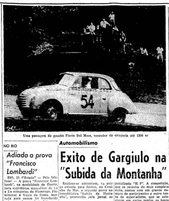 Flavio Del Mese, com um DKW, no ótimo tempo de 8' e 4", vindo a seguir o Simca de J. A. Barbosa de Campos, com 8' e 10". Os outros foram A.