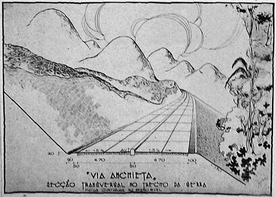 O traçado da "Via Anchieta" obedece às mais rigorosas condições técnicas. Assim, no planalto, as curvas terão, em planta, raio mínimo de 300 metros e, na serra, 100 metros. Os motoristas terão, no planalto e na baixada, uma visibilidade mínima de