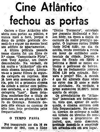 Em 2/3/1975, após a última sessão do filme Zardoz, da Fox, com Sean Connery e Charlote Rampling, iniciaria um período de reformas, para em seguida ceder seu espaço aos cinemas Studio Atlântico. [[Mais...]].