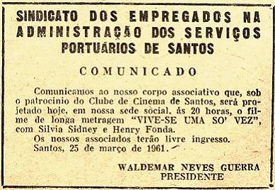 Sindicato portuário comunicava aos associados a exibição de um filme em sua sede, com apoio do Clube de Cinema de Santos: Vive-se Uma Só Vez (You Only Live Once), de 1937