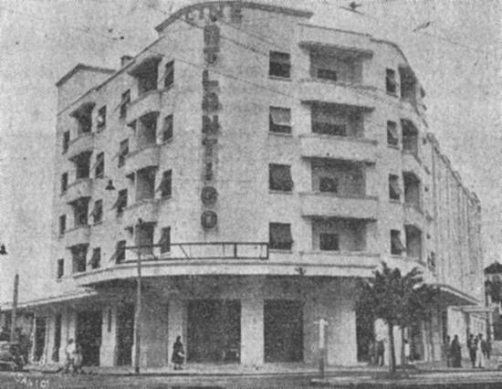 Aí temos, na Praça Independência, em pleno Gonzaga, o Cine Atlântico, o cinema líder da Empresa Santista de Cinemas, que a Empresa José B. de Andrade incluiu em seu circuito exibidor, tratando-se de uma feliz iniciativa da Empresa Imobiliária Bandeirante Ltda., que o fez construir pela firma técnica Duarte e Cia.