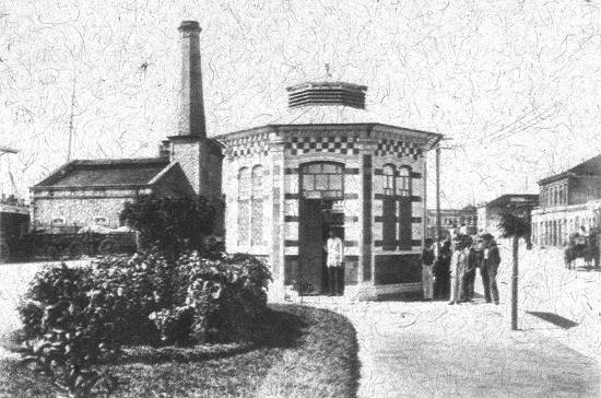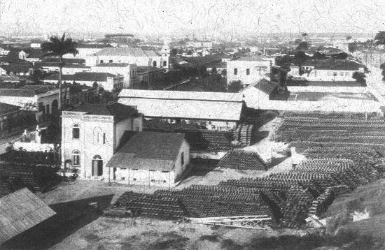 Estação Elevatória 2, na Rua Tuiuti, tendo à esquerda o cais do porto e uma usina de vapor que gerava energia para movimentar os guindastes do cais