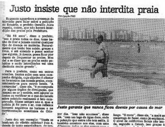 Quando era prefeito de Santos, em 1985, Oswaldo Justo (1926-2003) fez questão de convocar a imprensa para registrar seu banho de mar como forma de protesto a uma possível interdição das praias. "Há 58 anos, vou à praia todos os dias e jamais contraí qualquer tipo de doença ou moléstia. Naturalmente que tenho boa saúde, graças a Deus, e até entendo e posso aceitar que alguém, já doente, possa ficar pior depois de enfrentar as praias. Mas daí a se dizer que estão poluídas e serão interditadas vai uma distância muito grande", ressaltou, na época, em entrevista para A Tribuna.