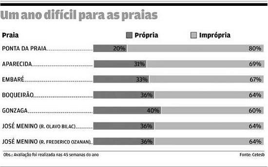 "Esses dez meses foram ruins para Santos. Em períodos de muita chuva, as comportas são suspensas com mais frequência e, quando isso ocorre, as águas dos canais chegam às praias e elevam o índice de coliformes fecais" (bactérias que contaminam a água através das fezes dos animais), afirma Claudia Lamparelli, gerente do Setor de Águas Superficiais da Cetesb.