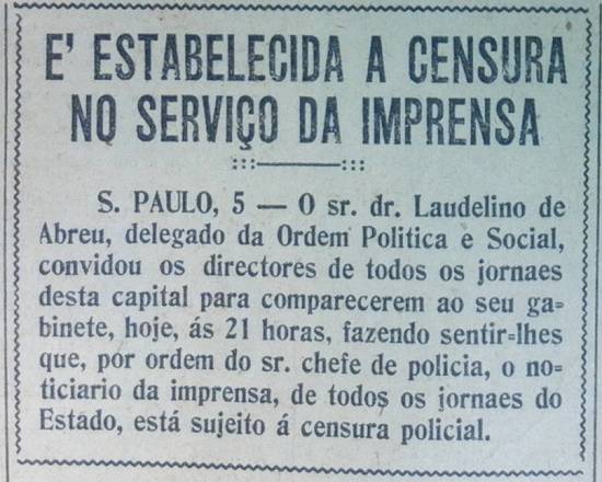 IMPRENSA - S. Paulo, 5 - O sr. dr. Laudelino de Abreu, delegado da Ordem Política e Social, convidou os diretores de todos os jornais desta capital para comparecerem ao seu gabinete, hoje, às 21 horas, fazendo sentir-lhes que, por orem do sr. chefe de