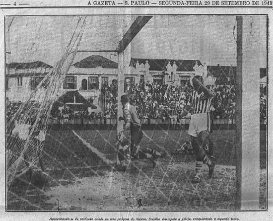 Jogo Santos 2x3 Corinthians, noticiado pelo jornal paulistano A Gazeta em 29 de setembro de 1941, vendo-se o campo do Santos, ainda sem parte das arquibancadas do estádio, permitindo observar o casario do seu entorno, na Rua D. Pedro I. Também não havia alambrado, separando torcedores de jogadores, apenas uma cerca de madeira. Em 1941, o Corinthians foi campeão paulista de futebol. Na legenda: "Aproveitando-se da confusão criada na área perigosa do Santos, Servilio desempata a peleja, conquistando o segundo tento".