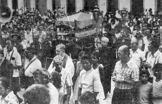 enquanto muitas outras se postavam na calçada, ajoelhando-se à passagem do esquife. Das janelas do centenário prédio que por muitos anos foi