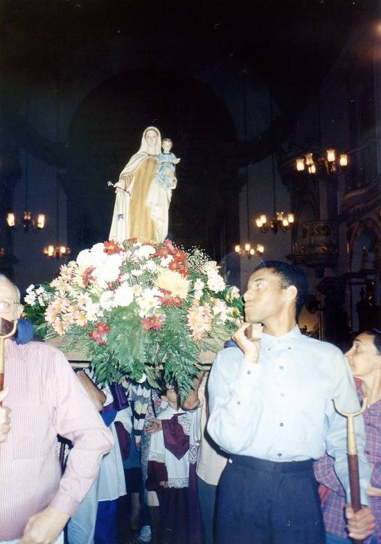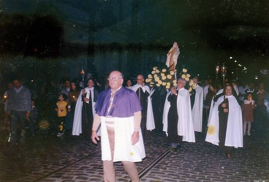 [06]. A Virgem Maria era precedida da cruz processional pesada e antiga da Ordem Terceira, ladeada por duas lanternas, vindo os irmãos terceiros em duas filas com veleiros nas mãos, o estandarte da Virgem levado pela irmã terceira dona Bernadete.
