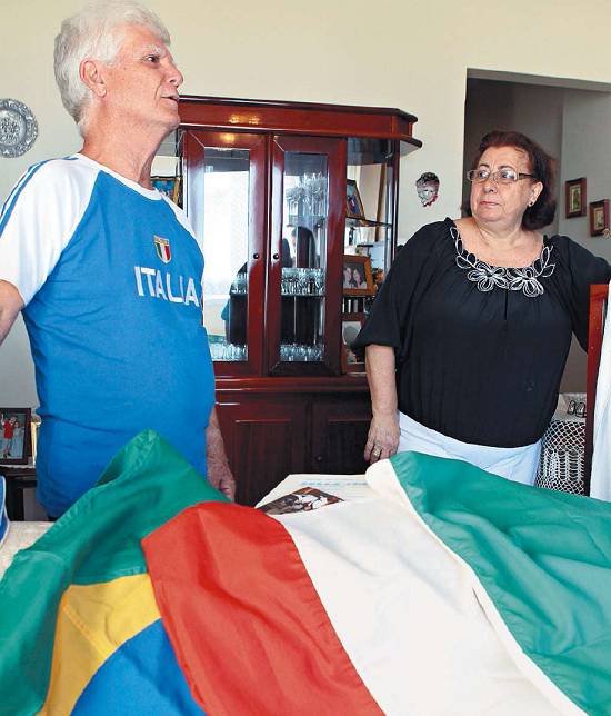 As bandeiras dividem o coração. Mas o nó na garganta vem na hora do futebol: "Quando joga o Brasil, torço para o Brasil; quando joga a Itália, torço para a Itália; quando jogam Brasil e Itália, saio da sala", brinca Domenico. A seu lado, a mulher, Lívia Foto: Nirley Sena, publicada com a matéria
