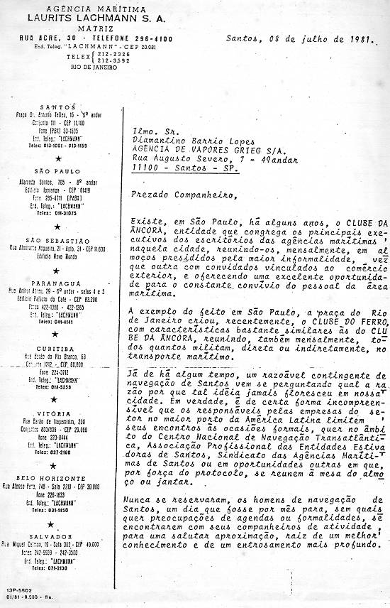 agências marítimas, reunindo-os, mensalmente, em almoços bastante informais, havendo eventualmente convidados vinculados ao comércio exterior, além