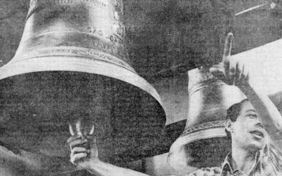 Inauguração de sinos - O padre Júlio mostra-se entusiasmado ao falar dos novos sinos da igreja, cuja inauguração, às 22h30 do dia 24, marcará o início da festa. São três sinos de bronze, montados em carrilhão, e avaliados em Cr$ 500 mil (dinheiro obtido com as festas juninas da paróquia).
