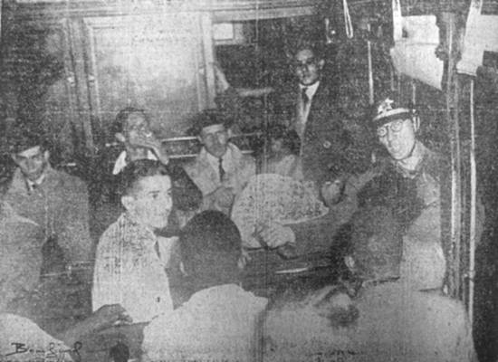 Com o bonde repleto de gente, o bombeiro faz a cobrança das passagens