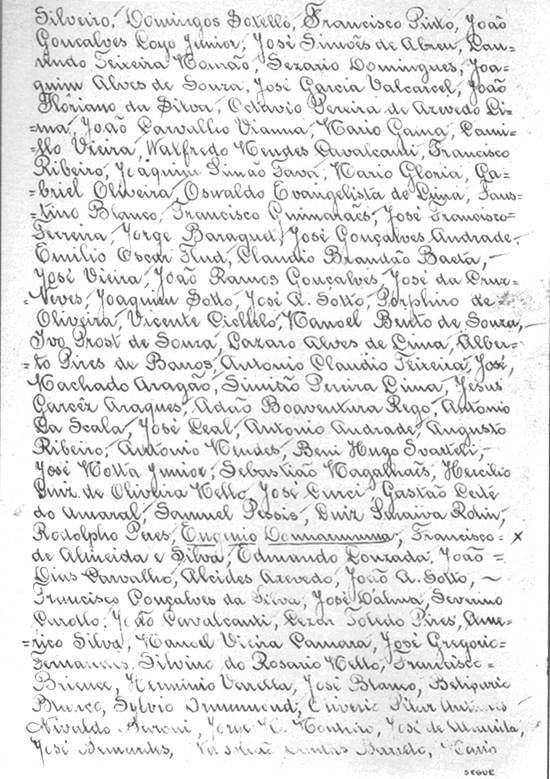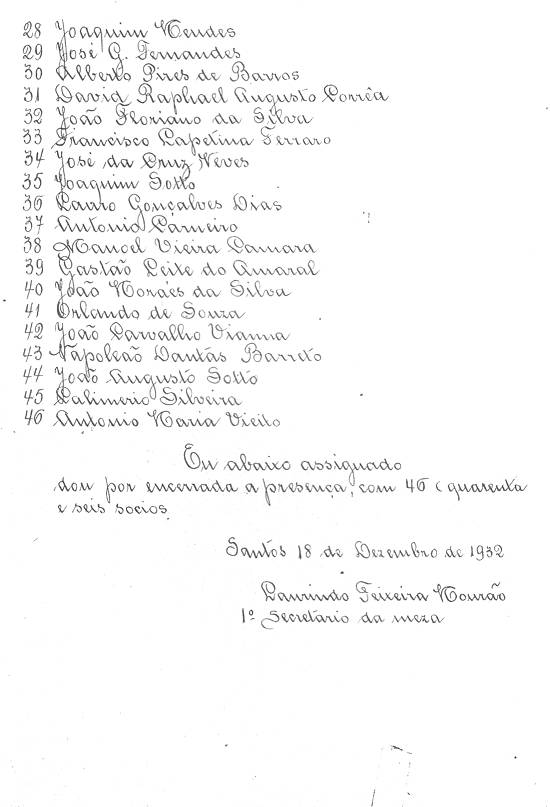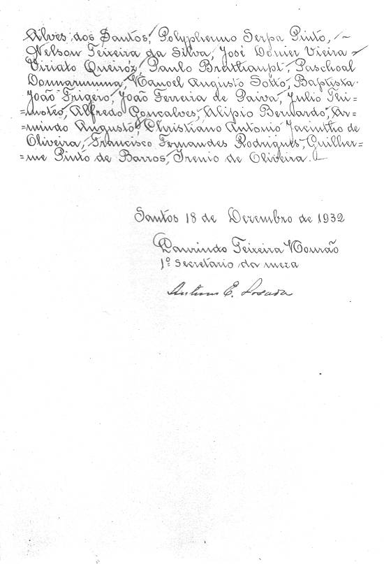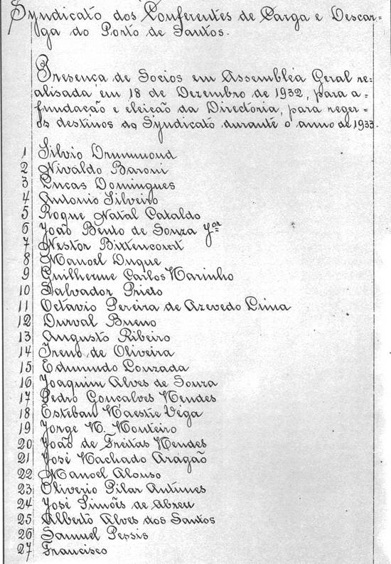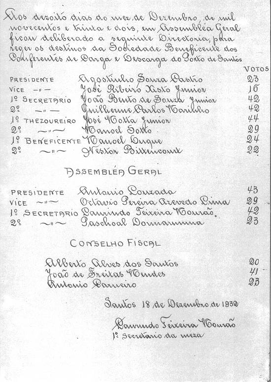 No final de 32, aquele ano marcado por tantos dissabores paulistas, sentidos mesmo pelos que nada compreendiam da natureza dúbia da luta fratricida, que foi feita a primeira reunião, fundando o Syndicato dos Conferentes e Consertadores de Carga e Descarga do Porto de Santos. Dia 18 de dezembro.