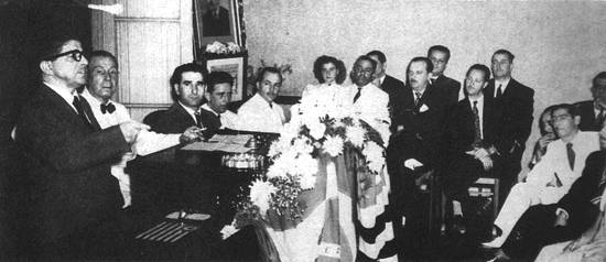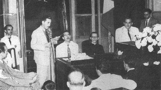 Solenidade em 1952, com a mesa composta da esquerda para a direita, por Antonio Feliciano, capitão Esculápio César de Paiva, o presidente Remo Petrarchi, o vereador João Gonçalves Neto, presidente do Sindicato dos Rodoviários e Milton Salles, o "furacão"