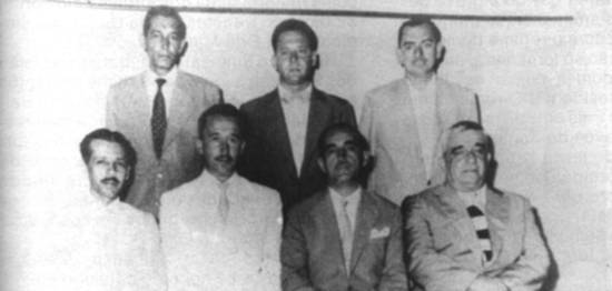 A diretoria que dirigiria o Sindicato no período 1957/59, sob o governo desenvolvimentista de Juscelino. Da esquerda para a direita, em pé, estão Romeu Vieira Dias, Nelson Baroni e Antonio Dias Portela. Sentados, Elysio Pestana, Osmar Diegues, Serafim Mendes e Nestor Bittencourt