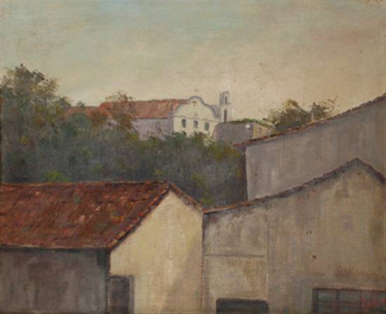 com algumas casas ao fundo. A luz é tênue e confere à obra um halo de irrealidade", segundo a ficha catalográfica da obra