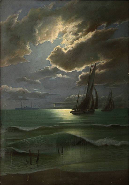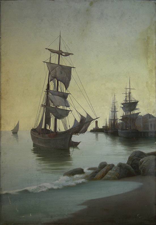 Fernández, com 122x176, realizada na primeira metade do século XX. "Uma paisagem idílica marinha que representa uns barcos navegando sob a luz da
