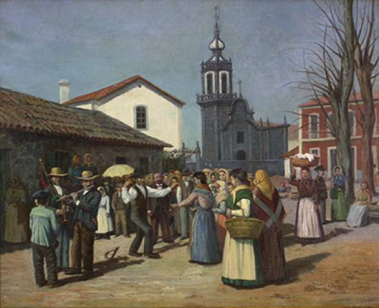 Fernández, com 60x49 cm, datada de 1907. "Cena de costumes que representa uma festa na praça de uma vila. O centro da composição vem marcado pelos