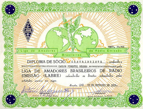 Diploma de sócio da Labre, emitido em 1976 em Brasília, habilitando o radioamador PY2-WGR